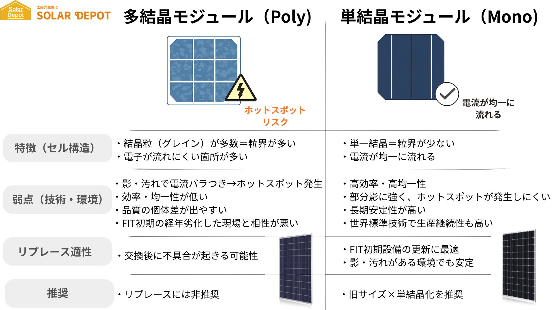 → 多結晶が影環境でホットスポットを起こしやすい理由を詳述。